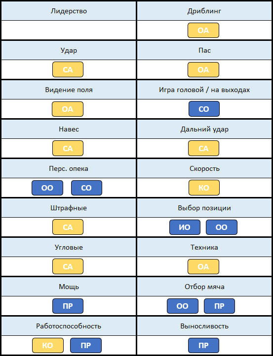 И лично мне всегда было не очень удобно использовать скриншот из телеграм-канала, где каждому типу тренера приписано, к каким скиллам он даёт бонус. А запомнить пока не получается, да и вряд ли оно надо. Плюс в этом сезоне данный функционал расширили и некоторым тренерам ещё добавили влияние на скиллы, соответственно появился второй скриншот. В общем, для собственного удобства сделал такую табличку.