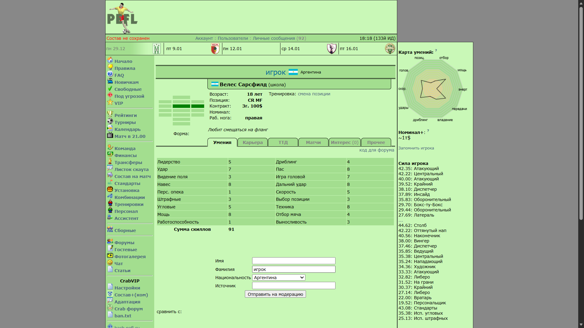 | Лидерство | 5 | Дриблинг | 3 | | Удар | 4 | Пас | 4 | | Видение поля | 3 | Игра головой | 3 | | Навес | 5 | Дальний удар | 5 | | Перс. опека | 4 | Скорость | 5 | | Штрафные | 6 | Выбор позиции | 2 | | Угловые | 2 | Техника | 5 | | Мощь | 7 | Отбор мяча | 6 | | Работоспособность | 3 | Выносливость | 5 | | Сумма скиллов | 77 | | | | | |